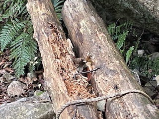 【登山道情報】住吉川の丸太橋が腐っています 2025年11月12日(水)Bテスト例会の西お多福山~一軒茶屋~筆屋道コースで神戸市の住吉川左岸の広場(休憩ポイント)近くの左岸より右岸に渡る丸太橋が腐食して危険な状態になっています。渡られるかたは、丸太橋の状態をよく確認してから注意して渡るようにしてください。また、手摺代りのトラロープはたるみ過ぎているので持つと余計に危険です。