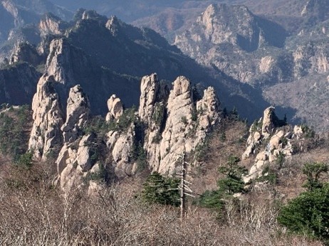 | 小屋はきれい ふとんは無い 3階建で暖房が効いている | 恐竜稜線を小屋から見る | 雪岳山は鋭い岩峰が多い |