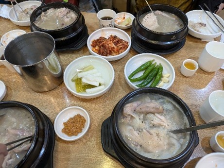 | ソウル行きバス 3列でゆったりの座席 | 漢方サムゲタンの夕食 | あっさり味で美味しい |