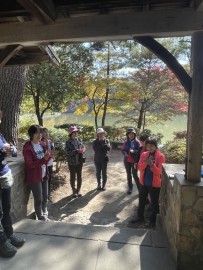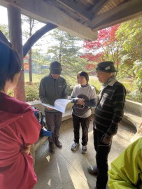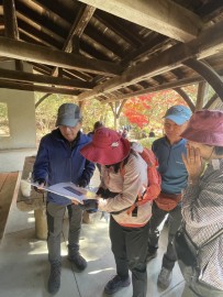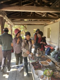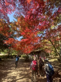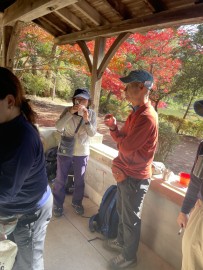 ポカポカ陽気です! | 昼食場所の東屋到着 見事な紅葉がお出迎え |