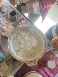 | クラムチャウダー完成!アサリもたっぷり入ってるよ | 組織部スタッフが自宅でせっせと作ったタコスミート、温めてます | トルティーヤを持って順番待ち | タコス、クラムチャウダー、スウィーツのメキシカンランチ完成!! |