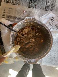 | 温かいスープが美味しい | 完食です♪ | 地面まで赤く染まってますねー | 組織部スタッフも自画自賛 美味しい♪ |