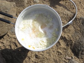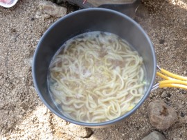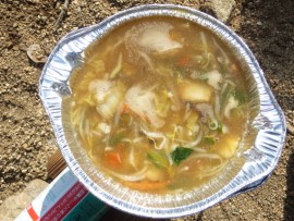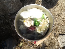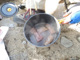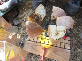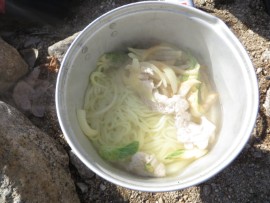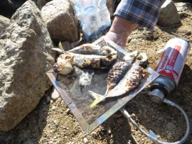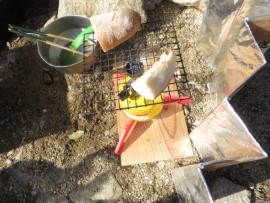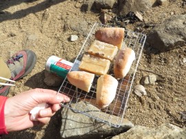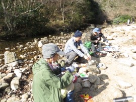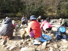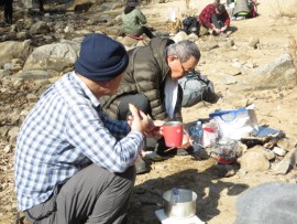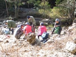 | 二本松バス亭~善助茶屋跡~大龍寺と歩いて11:20に市ケ原に到着。 暖かく風もないので日なたの川原でキャンプ飯調理すると決定! 何組か川原で昼食をとっておられましたが、比較的広く空いている良い場所を確保できました 直後に大勢の団体さんが来られたので間一髪でした。\(^_^)/ キャンプ料理は各自で。バーナーを持っていない人は、持っている人のを使わせてもらったり、余分に持っている人からお借りしました。 この後コーヒーも飲み、食事時間11:20~12:35とゆっくり過ごしました。 満腹のお腹を抱え、布引き貯水池から新神戸駅へ! 下山時間 13:30 当日は、青空が広がり、風も弱く穏やかで、キャンプ料理を楽しむという今回の例会には絶好の天候であった。このような天候の下、暖かい日差しを受け、それぞれが用意してきた料理を十分楽しむことができた。 冬季の例会は、寒いこともあり、昼食はさっと済ませて休憩時間は短めとなることが多いことから、キャンプで使う調理道具や食材を持って行けば、暖かい料理を作ってゆっくり過ごせるのでは、と思って企画しました。」 |