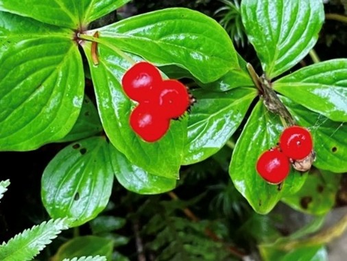 | 折立登山口を出発 | 濡れて鮮やかなゴゼンタチバナの実 | 小雨の木道を進む |
