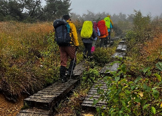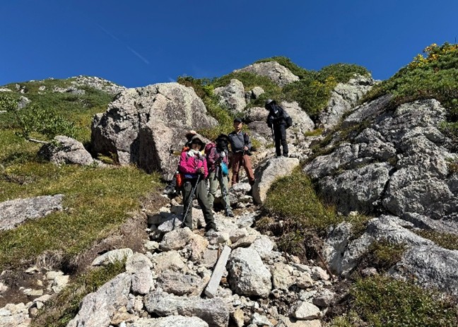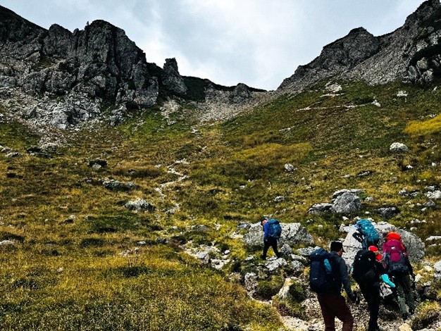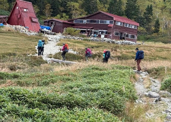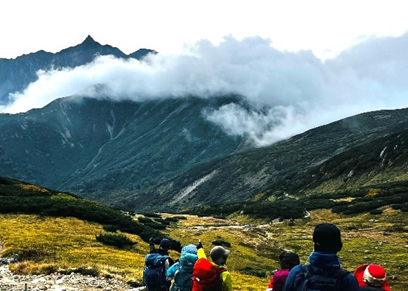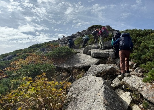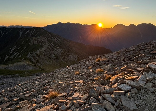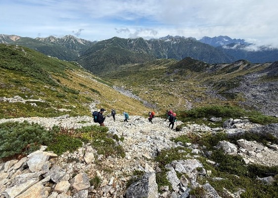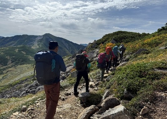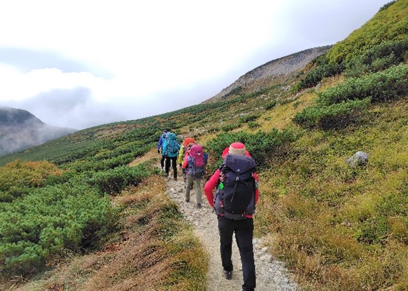 | 天候に恵まれ初秋の北アルプス縦走を存分に楽しめました。歩行距離42.5km、登り3,800m下り4,050mはかなり過酷でした。参加者は歩き切った達成感を感じられたと思います。天候面で難しくなるか体力面で無理な人が出たら鏡平小屋宿泊でエスケープを考えていました。双六小屋で全員が頑張って歩く意志を示したので気合を入れ直して笠ヶ岳に向かいました。疲れて空腹の身体に、笠ヶ岳山荘の夕食カレーが旨かったです。 笠ヶ岳の山頂は快晴の日の出で素晴らしい景色、幸せな気持ちになりました。頑張ったご褒美です。 笠新道の下りは樹林帯に入っても岩々の急降下で、疲れた脚で降りるのはつらく長く感じました。 太郎平で熊出没の情報が有り熊撃退スプレーを持参。熊目撃情報が多いので必要装備になってきたように思います。 |