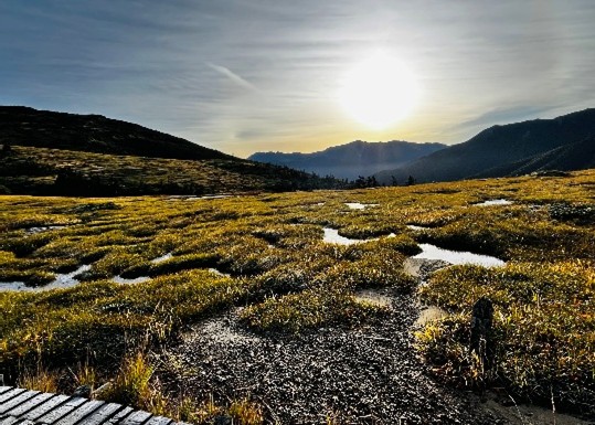 | ベンチに霜が降りた太郎平小屋 | 振り返れば薬師岳と太郎平小屋 | 朝日に輝く太郎平の池塘群 |