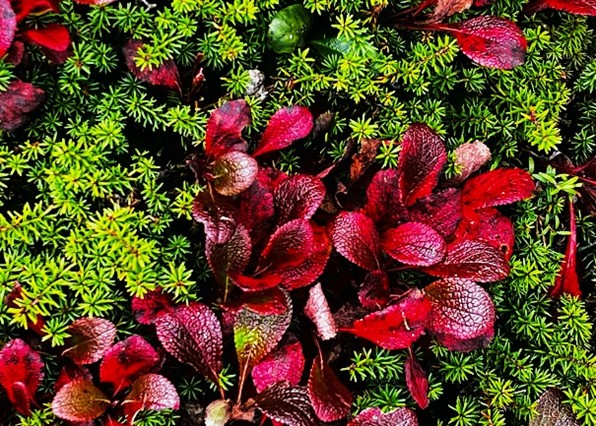 | 紅葉のウラシマツツジとガンコウラン | 弓折乗越 槍穂の絶景を見ながら歩く | アップダウンをひとつひとつ越えていく |