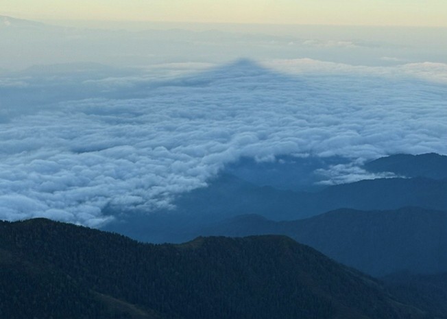 | 大キレットから朝日が昇る | 笠ヶ岳山頂 天気よく最高の気分 | 雲海に笠ヶ岳の影が見える |