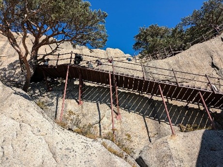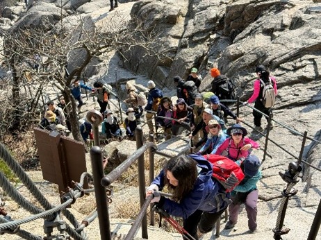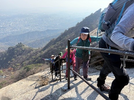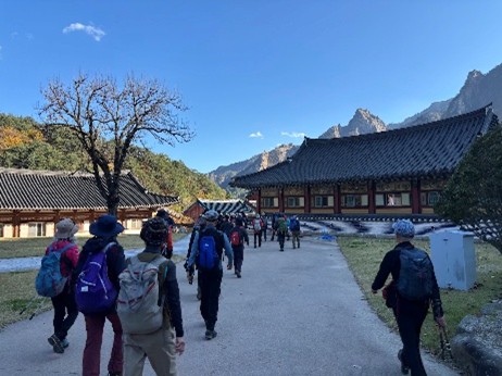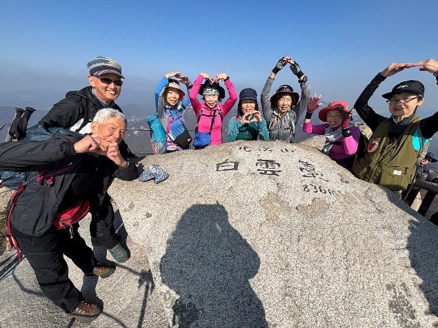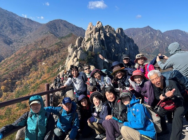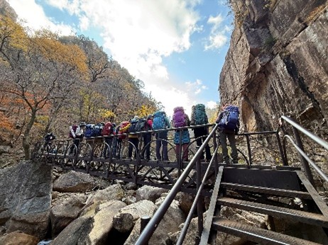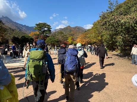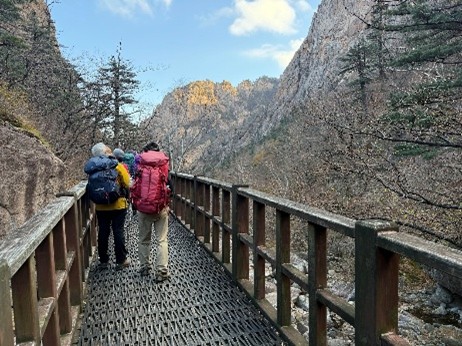企画の段階から変更が多く苦労したが、その甲斐あって参加者の満足度が高い例会になった。 韓国の山は特徴的な岩山が多く標高は高くないが面白い。今回の最高峰は大青峰(デチョンボン)1708mだが、山頂は氷点下の強風で寒かった。小青待避所は暖房が効き快適。夜間に若干の降雪があったが、軽アイゼンを使うまでは至らなかった。六甲の真冬より寒い感覚。 ソウル近郊の北漢山は最高気温10°程度で快適だった。紅葉もきれいで秋と冬両方を楽しめた。 5月に下見を兼ねた個人山行でコースタイム等を検討した結果、大幅にコースを変更した。 コースタイムと難易度の事前情報はあったが、1~2割増しのタイムが必要だった。 日本では情報が少なく市販の登山地図はない。等高線の入った地図をWEB上で探した。 ジオグラフィカ又はYAMAPで現在地把握が出来ることを調べた。ジオは設定必要だが見やすい。 避難小屋は韓国国立公園事務所管轄の公営。一泊1,500円以下と安価。7月以降予約システムが抽選制に変わった。実質外国人が抽選に入れないため、抽選後空きがあれば予約可能だった。そのため避難小屋利用可否で2通りの計画を用意したが幸い予約できた。 費用は航空運賃を含め5泊6日で7万円程度。同日数の国内宿泊例会より安価であった。電車・バス・タクシーを含む公共交通機関が日本の半額程度、食事や宿舎も安いので、言葉の問題が無ければもっと例会を実施したい。 。 |