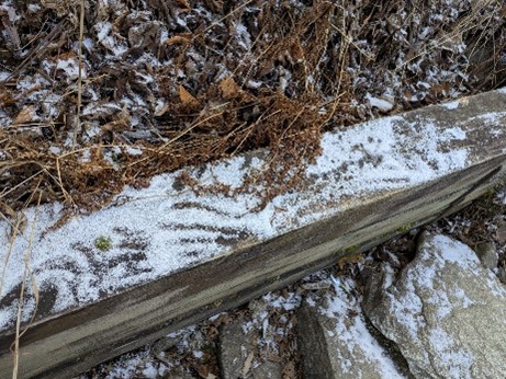 | 階段地獄はつらい しばし休憩 | 長い階段を下りる 遠くは北朝鮮の山? | うっすらと雪が残る |
