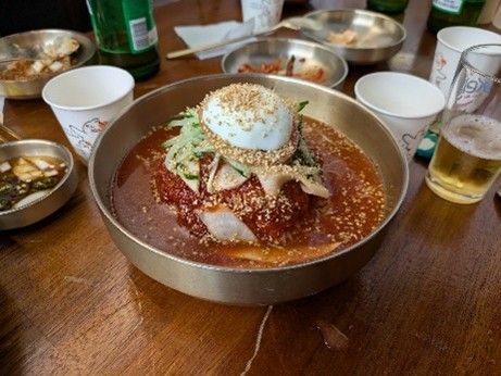 | ソウル行きバス 3列でゆったりの座席 | 漢方サムゲタンの夕食 | あっさり味で美味しい |