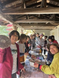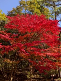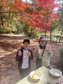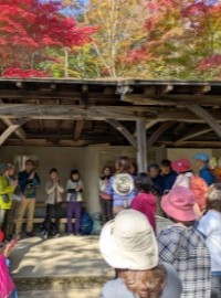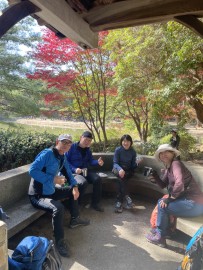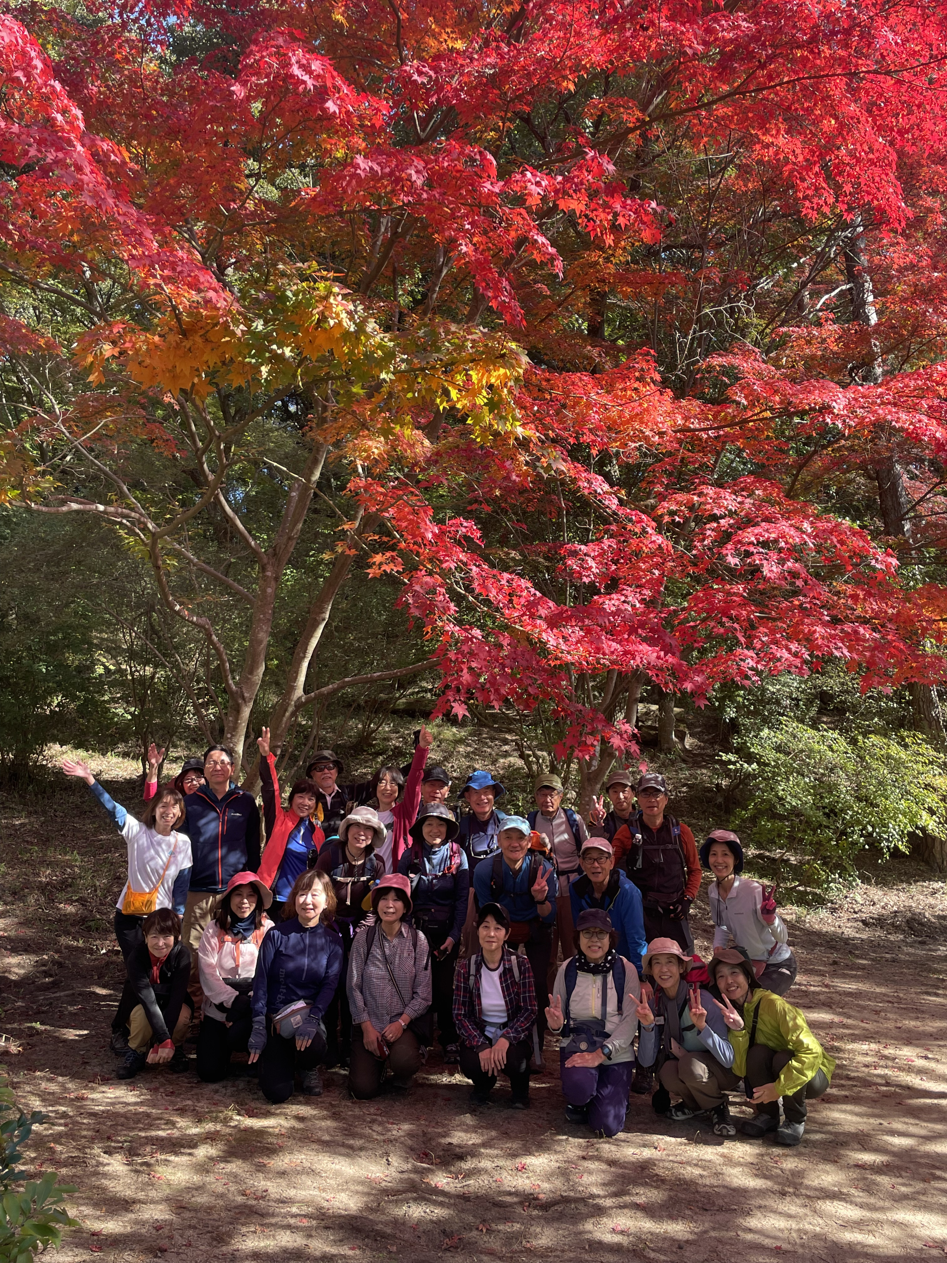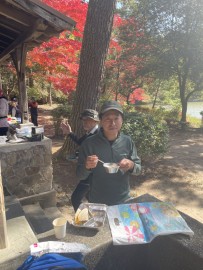 ポカポカ陽気です! | 昼食場所の東屋到着 見事な紅葉がお出迎え |