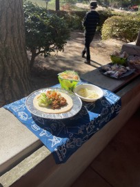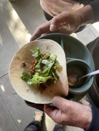 | クラムチャウダー完成!アサリもたっぷり入ってるよ | 組織部スタッフが自宅でせっせと作ったタコスミート、温めてます | トルティーヤを持って順番待ち | タコス、クラムチャウダー、スウィーツのメキシカンランチ完成!! |