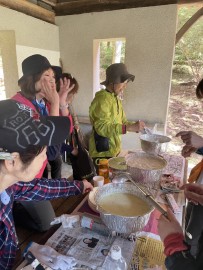 | 温かいスープが美味しい | 完食です♪ | 地面まで赤く染まってますねー | 組織部スタッフも自画自賛 美味しい♪ |